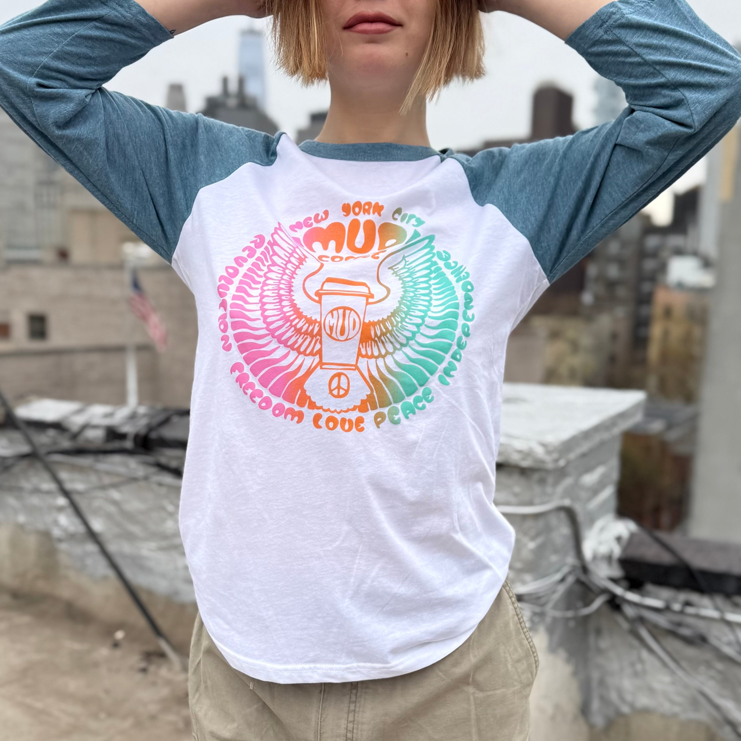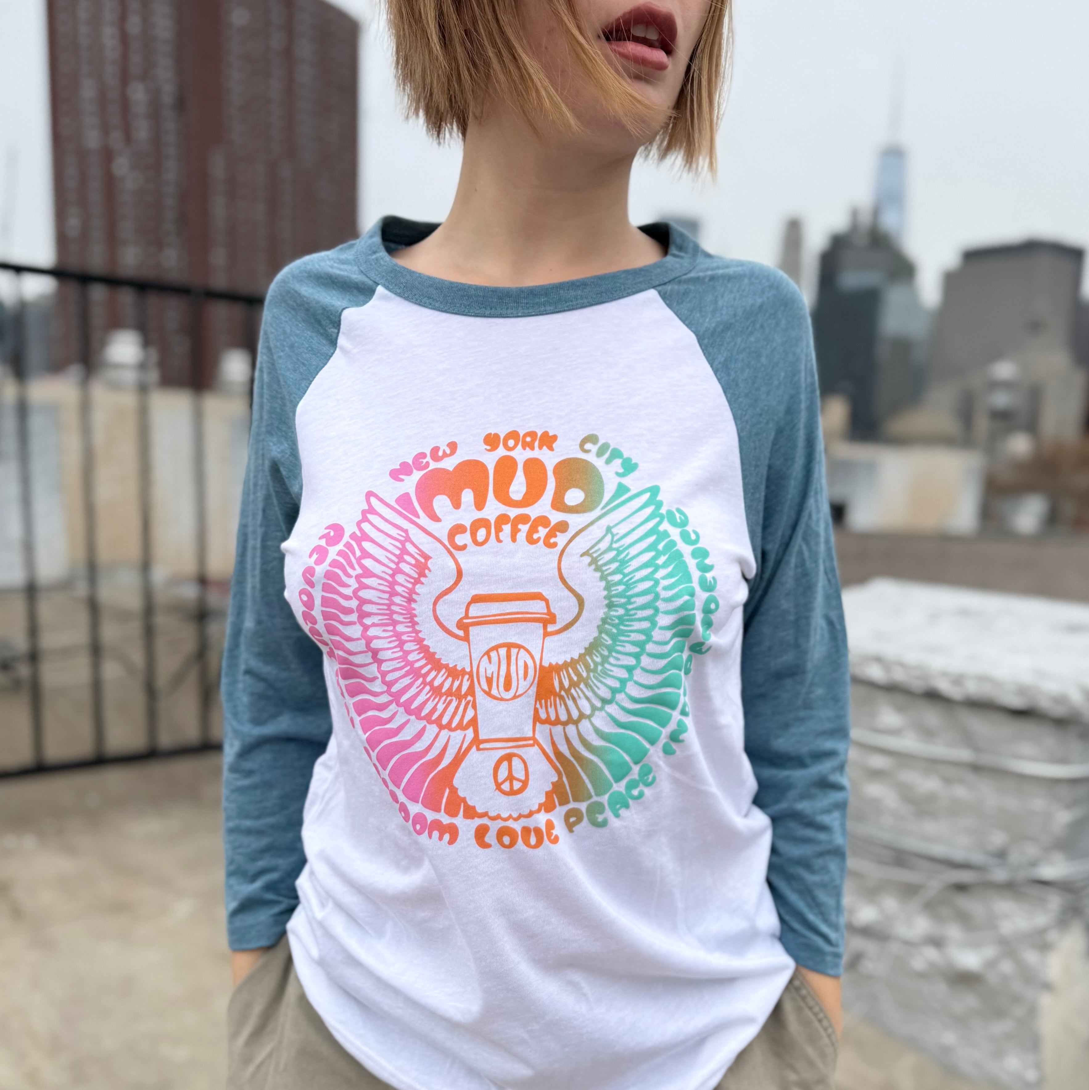 Unisex Long-sleeve Baseball Shirt with Color flow Mud Wings on Chest. Indigo Blue Sleeves and White Body. Hand printed in New York City.